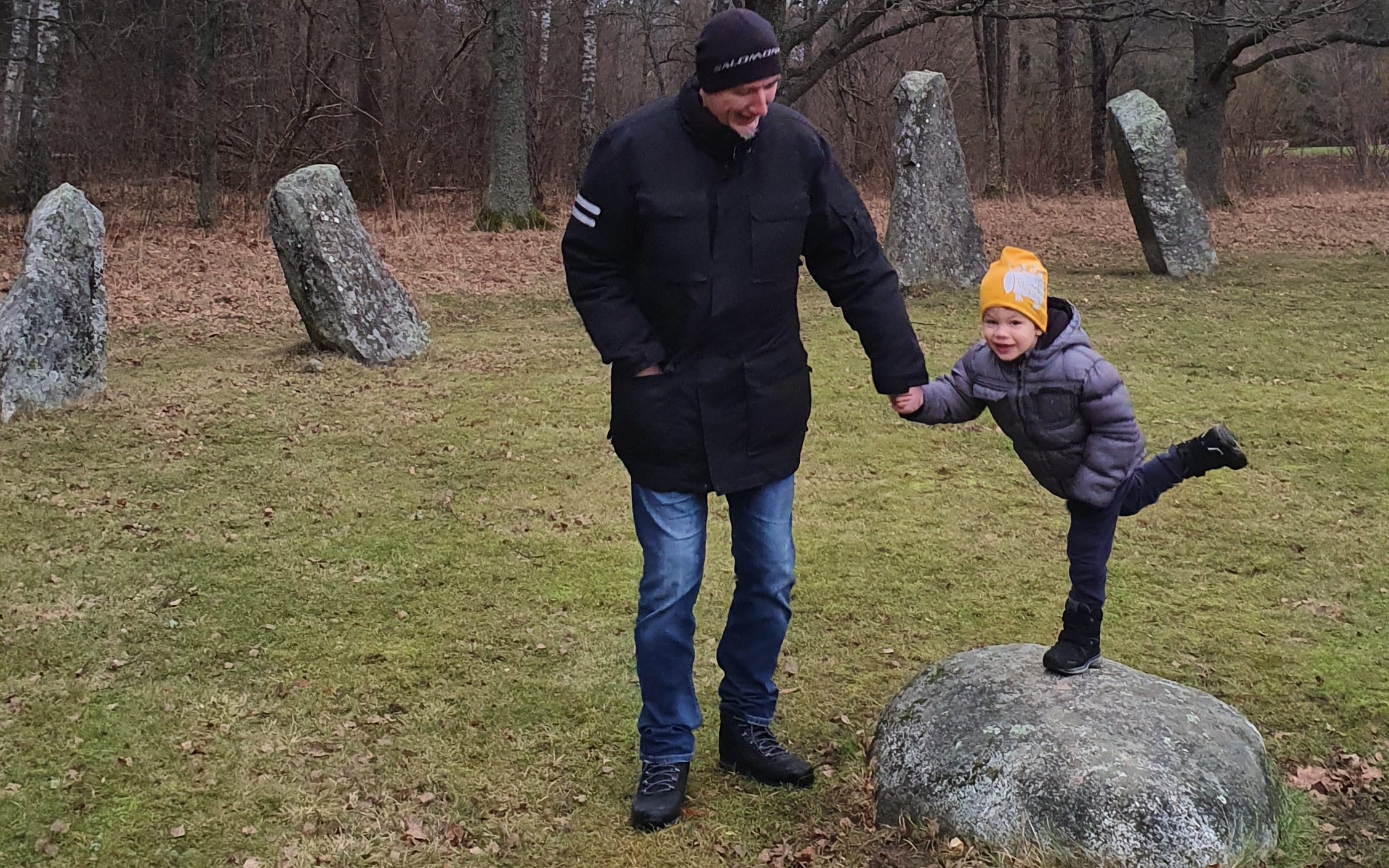 Az Anunds domb egy tipikus viking, kőhajó típusú temetkezési hely, mely stílus akkoriban a legtöbb germán népre jellemző volt. A helyszínen kóborolva igazán kultikus érzés lett úrrá rajtunk: a hatalmas, rúnákkal teleírt, különböző formákban elhelyezett óriás kövek között, a ködös, szeles időben sétálgatva az ember úgy érezhette, hogy valóban egy középkori viking temetkezési helyre érkezett. A borús, szeles idő is rásegített erre a hangulatra, viszont 4 évesünk nemsokára véget vetett képzeletbeli időutazásunknak, és mit sem törődve az ősi hangulattal le-fel ugrándozott a köveken és hangosan kacagva rohangált a sírdombokon és a pocsolyákban. Mielőtt bárki megszentségtelenítésre gondolna, ez itt megengedett, az egész terület bejárható, felfedezhető, ugrálható, sőt előadásokat, koncerteket is szoktak itt tartani, ugyanis a svédek elmélete az, hogy így érdekesebbé tudják tenni azok számára is a helyeket, akiket ez amúgy nem vonzana. Hát, mit mondjak, sikerült.