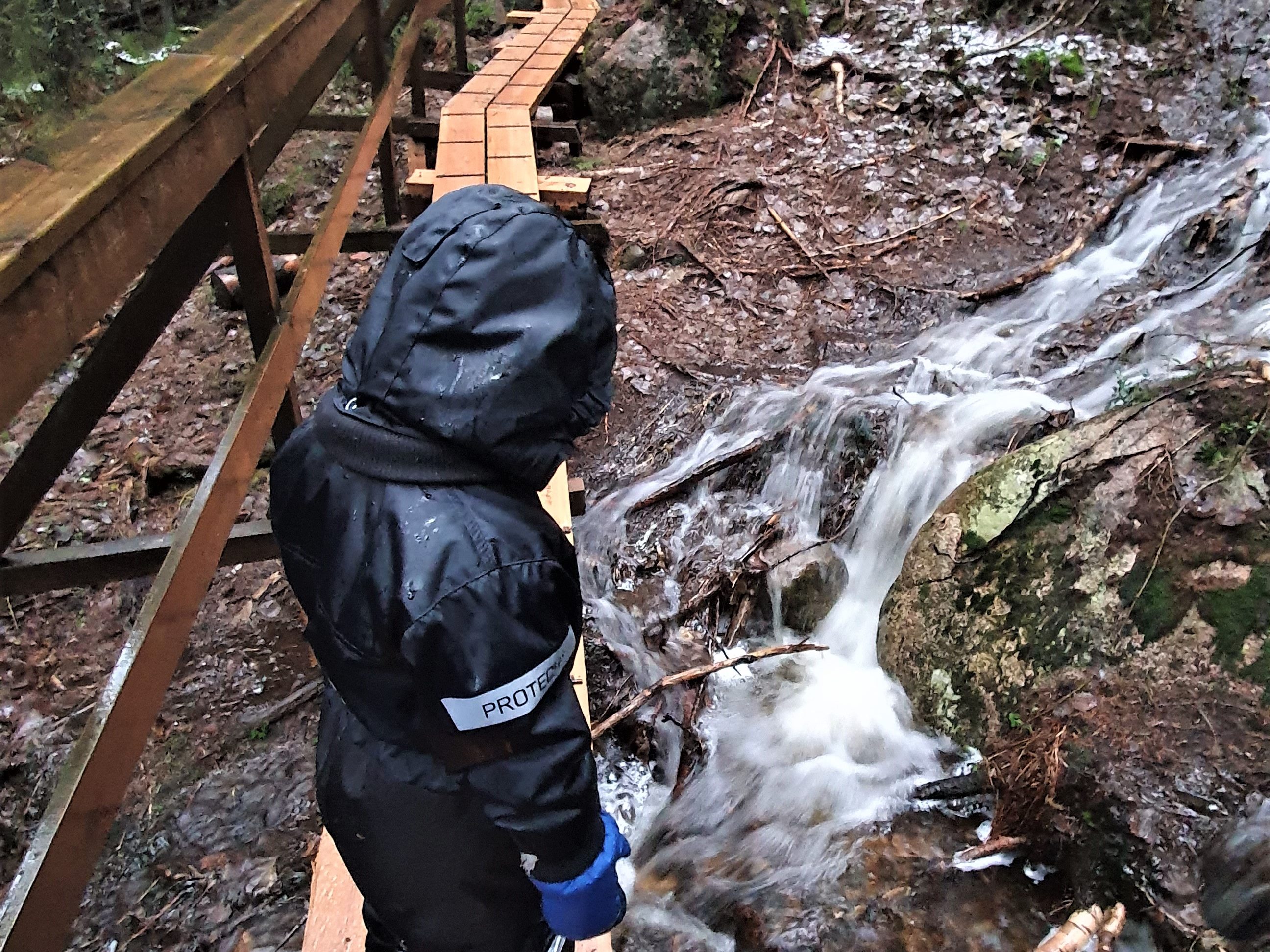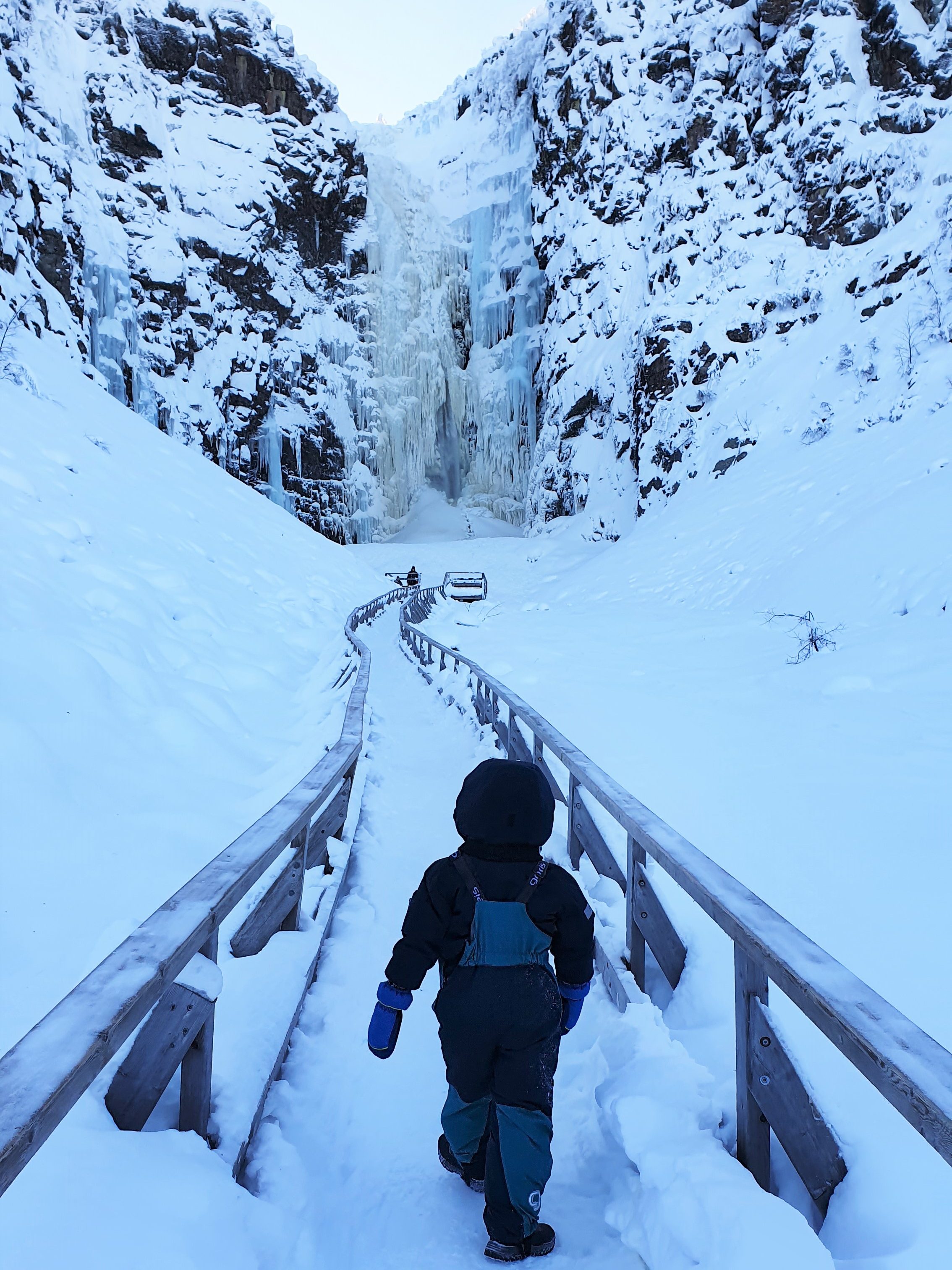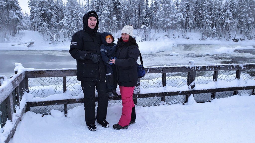 Az elején minden szépen és jól ment, de persze gyerekkel túrázni nem egy könnyű dolog. Félúton már kezdődtek a nyafogások, hogy elfáradt, éhes, hideg van, de elég jól kihúztuk majdnem a vízesésig egy kis noszogatással, csokival, mesével, dallal. A vízesés előtt 200 méterrel van egy nagyon szép kilátó, ahonnan látszik a vízesés és a völgy, ahol a patak tovább szalad. Ugyanitt van egy tűzhely és egy szó szoros értelmében vett menedékház, azaz egy kunyhó, amiben van egy ágy és egy kályha. A nemzeti parkban több ilyen menedékház van, némelyik csak melegedésre, pihenésre szolgál, de van olyan is, melyben lehet éjszakázni. Ezekben mindig van felvágott tüzifa, és nem kell előre foglalni, hanem bárki ott aludhat, aki arra vándorol. Pihenés után nekivágtunk a „csúcshódításnak”, azaz a völgyhódításnak, mivelhogy az ösvény a vízesés aljához vezetett. A kilátótól a vízeséshez falépcsőkön kellett leereszkedni, majd korláttal kiépített pallón megtenni az utolsó 100 métert. Itt érdekes módon nagyon kezdett fújni a szél, és a hőmérséklet -26 fokra süllyedt, ami egyáltalán nem volt egy kellemes érzés. Mi felnőttek is fáztunk, és a gyerek sírt. Egy béna közös szelfi után vissza is indultunk, hogy ne kelljen tovább szenvednünk. Visszaérve a kilátó pihenőjéhez megmelegedtünk a tűznél, kellő mennyiségű csokit vittünk be a szervezetünkbe, ami megnyugtatta a gyereket, majd visszaindultunk a nemzeti park bejárat felé. A visszafele út, mint mindig, sokkal rövidebbnek tűnt, lassan a gyerek is jobbkedvre derült és nagy nehezen meglett a túra. Nagyon büszkék voltunk rá, sok nyafogással, sírással, hisztivel, de mégis megtette ezt, a korához képest nem kevés távot télben, hidegben, hóban. A legmenőbb kis pasas volt aznap a hegyen.