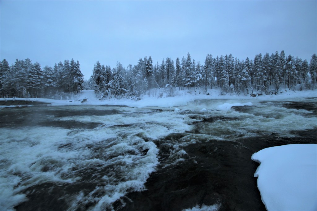 Következő egynapos kirándulásunk Piteåból a festői Storforsen zuhataghoz volt, mely a 250 m3/másodperces vízhozamával Európa legterjedelmesebbje. Uticélunk parkolójához érve sokkoló tény fogadott: a zuhataghoz vezető erdei ösvény és híd a fél méteres hó és jég miatt le volt zárva. Majdnem sírni kezdtem, hisz többek között ez volt utazásunk egyik fénypontja, és mindenképp szerettem volna látni. Hál´Istennek eszembe jutott, hogy nézzem meg a Google Maps-et, hogy nincs-e véletlenül más lehetőség a megközelítésre, és ekkor fedeztem fel, hogy van egy autóút is, ami kb 1,5 km kerülővel közvetlenül a zuhatag kilátójához vezet, kihagyva ezzel az odavezető túrázást. Mivel ez utóbbi a hó miatt amúgy is lehetetlen volt, visszapattantunk a kocsiba, és elmentünk a kilátóig, mely a zuhatag legnépszerűbb részéhez vezetett. Rámpákon és hídakon télen is könnyen megközelíthető a parkolótól csak kb ötszáz méterre található, ezért ideális uticél még 4 évesekkel is. A látvány elbűvölő volt: egy, a hegyoldalról 82 méter hosszan lezúduló széles, vadon tomboló vízesés, vastag, fehér hóréteggel fedett fenyők és sziklák között. Az odáig egyfolytában ugra-bugráló, kacarászó 4 éves kisfiunk is megállt pár percre és megdöbbenve nézte a nagy, hömpölygő vízrengeteget. Tetszett neki.