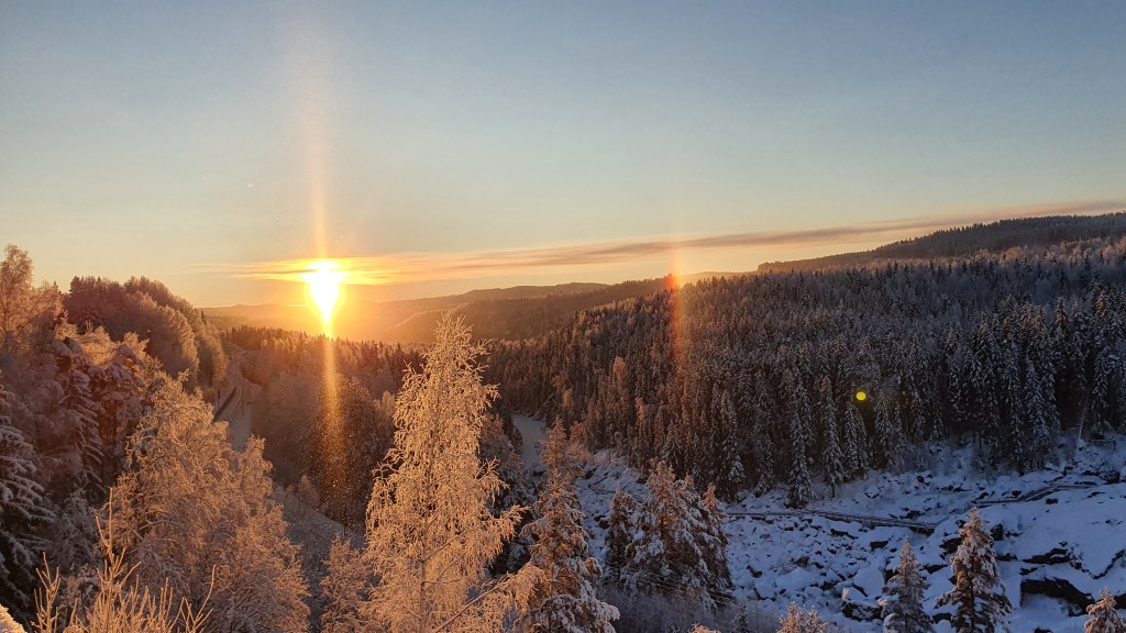 Másnap útba ejtettük a Döda fallet, azaz a Holt zuhatag nevű természeti rezervátumot, mely nem messze volt szállásunktól. Gyönyörű porhóval fedett szakadék szélén kezdődött a túra, és akadálymentesített pallókon lehetett leereszkedni a mélybe, ahol egykoron robajló víz tört utat magának, most viszont csak az üresen egymásra meredő sziklák őrzik a csendet. Az üres vízesés egy emberi hiba következménye, melyet még 1796-ban követtek el, amikor az iparosodás elején meg akarták könnyíteni a folyón történő faszállítást. A zuhatagon lehetetlen volt fákat szállítani, mivel annak ereje kettéroppantotta volna a rönköket, ezért a terv szerint egy csatornán elvezették volna a víz egy részét, amin a fákat le lehetett volna ereszteni a vizen. A probléma csak az volt, hogy a megépített gát a tavaszi áradáskor megrepedt, és a zuhatagot tápláló tó vize szökőárként tört előre egészen a Balti tenger partjáig, maga után hagyva a Holt zuhatagot. Nagyon élveztem, hogy ottlétünkkor nem volt rajtunk kívül más túrázó, és tanúi lehettünk életünk legszebb napfelkeltéjének, és annak, ahogy a nap a hegyek ormai mögül megvilágította a völgyet függőleges szivárványt képezve a levegőben szállingózó jégkristályokon.