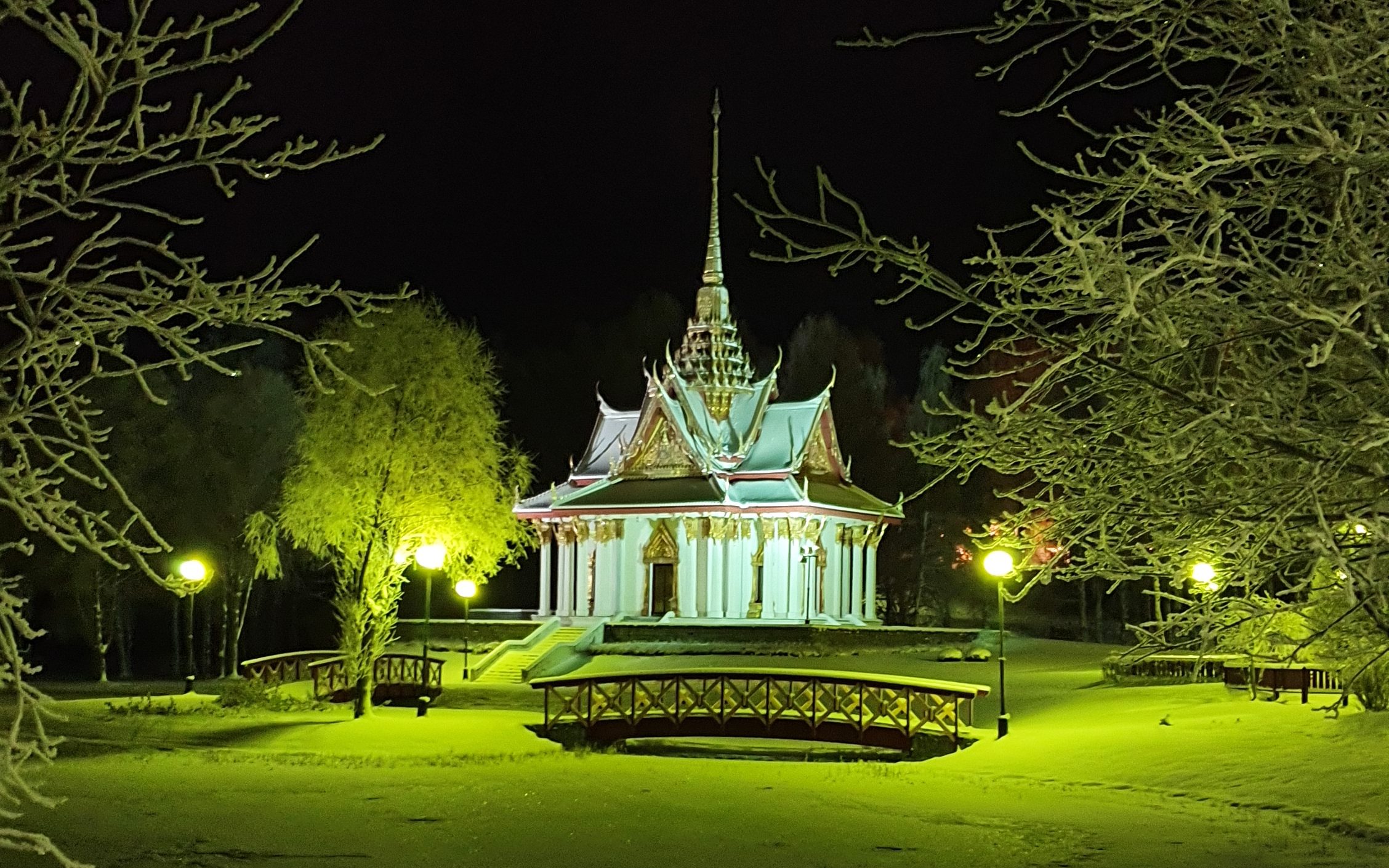 Kalixból újra dél felé vettük az irányt, de még mindig az ország északi részén maradtunk. Legújabb uticélunk a Fulufjällen, vagy magyarul a Fulu havasok voltak, ám a távolság miatt megaludtunk kb félúton az Indal folyó mentén egy kis hotelben. A szállodát egy család működtette és újra csak mi voltunk az egyetlen vendégek, és tök olcsó volt. Az idő szűke miatt nem volt túl sok lehetőségünk felfedezni a környéket, de este, rögtön érkezés után elmentünk a környéken levő híres Thai pavilonhoz, mely egyedülálló a világon, hisz állítólag Thaiföldön kívül nincs ehhez hasonló. A pavilont Chulalongkorn thai király tiszteletére emelték 1998-ban, aki 100 évvel azelőtt járt Svédországban, abból a célból, hogy tanulmányozza az ország erdészetét. Chulalongkorn király nem csak Svédországot látogatta meg, hanem más, a XIX-ik században fejlett országot, hogy az itt látottakat magával vigye a messzi Ázsiába, és saját országát fejlessze. Emiatt a király ma is igen népszerű Thaiföldön. A pavilon sajnos nincs nyitva télen, de kintről is nagyon szép és érdekes látvány.