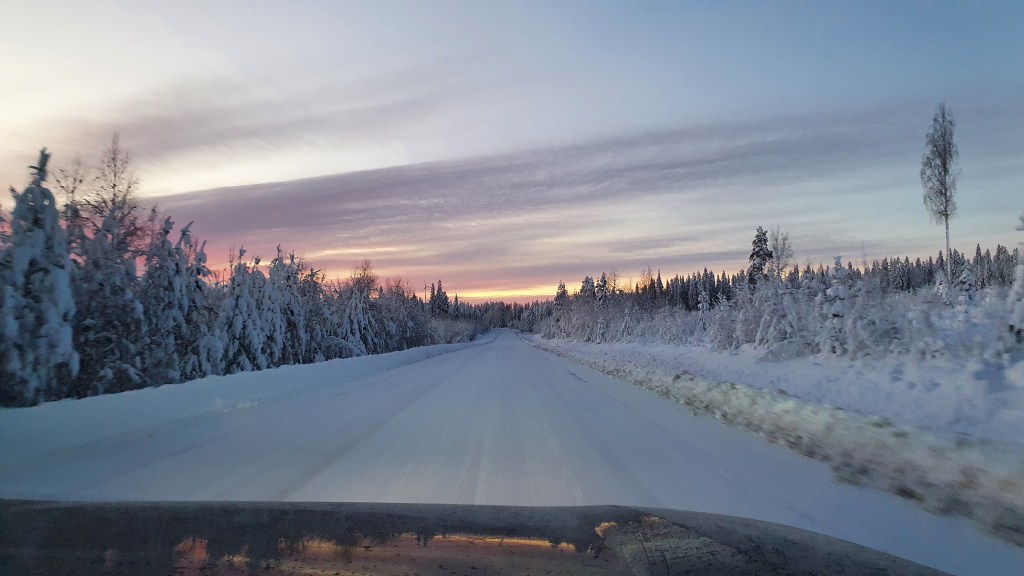 A kötelező fotózás és uzsonnázás után újra Piteå felé vettük az irányt, és szerencsénkre egész úton visszafelé gyönyörködhettünk a havas hegyormokon tükröződő lemenő nap rózsaszínes fényeiben.