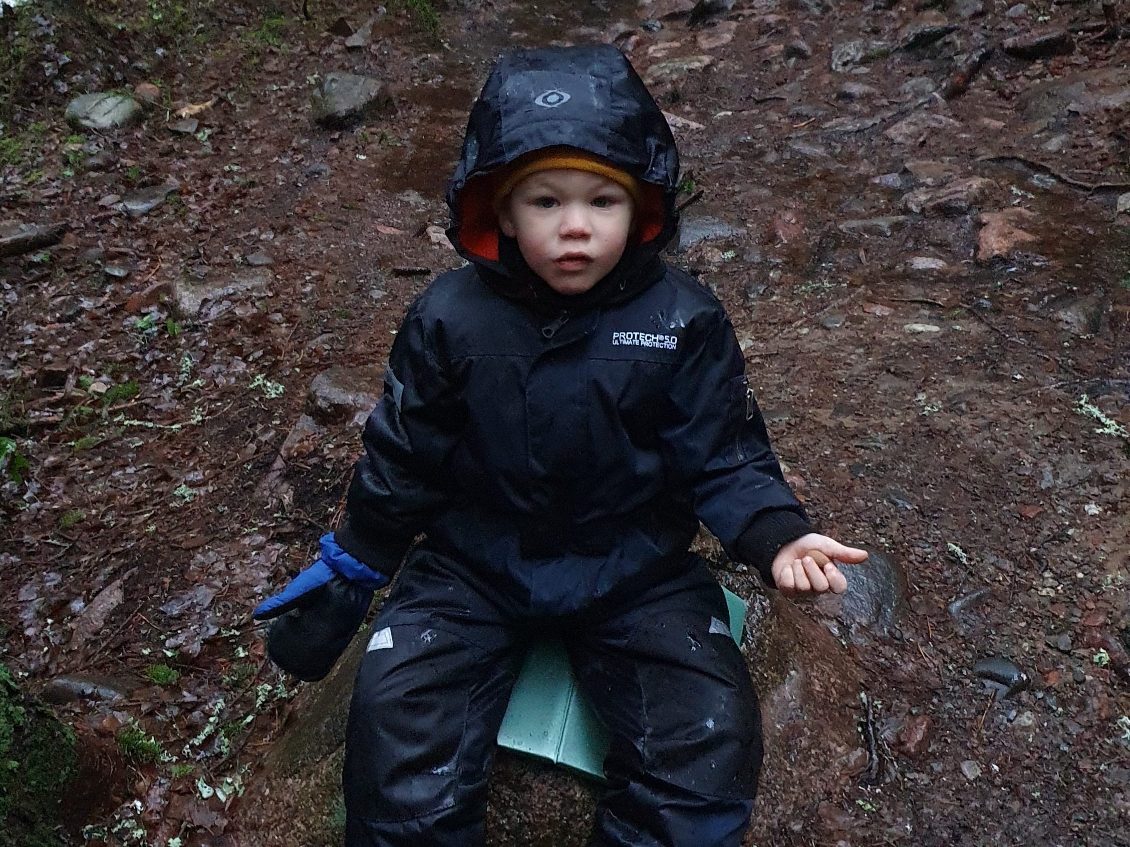 Sajnos itt már a hó teljesen átalkult esővé és csak esett és esett és esett. Egy idő után gyermekünk kijelentette, hogy elfáradt. Próbáltuk még biztatni, hogy jöjjön, mert nemsokára elérünk egy szép helyre, de sajnos mi sem úgy éreztük már, hogy ez így megéri. A fapallónak egyszercsak vége lett, és kiszélesedett az ösvény. Úgy tűnt, hogy talán itt jobban lehet majd haladni, de sajnos az erdő sűrűsége miatt tele volt gyökerekkel és sziklákkal, melyek az esőtől nagyon síkossá váltak. Végül leültünk kicsit pihenni, és bekapni egy kis uzsonnát.