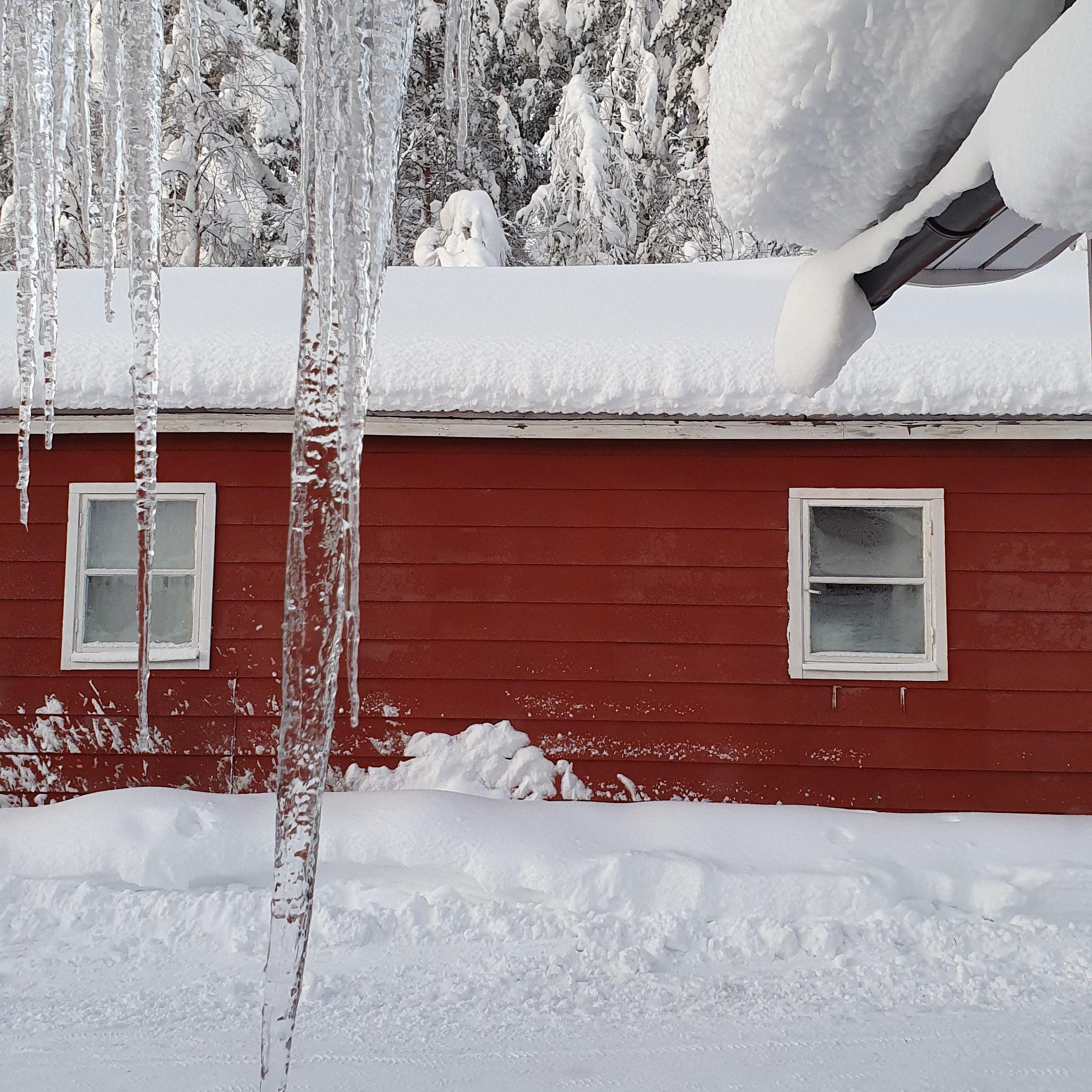 A Holt zuhatagtól a Njupeskär vízesésig hosszú volt az út, és ahogy beljebb haladtunk az országban, egyre ijesztőbb érzés volt. Órákig csak fehér lepellel borított erdei utakon haladtunk, hófödte fenyőerdők, szikrázó, befagyott tavak, dombok és völgyek váltakozása mellett. Héba-hóba jött szembe egy-egy rönkszállító teherautó. Akaratlanul is belegondolt az ember, hogy mi lenne ha itt állna le a kocsink. Hál’Istennek ez nem történt meg, és estére szerencsésen megérkeztünk a szállásunkra. Egy erdei menedékházban szálltunk meg, mely egyszerű, de nagyszerű volt. Svédországban nagyon elterjedt fogalom a menedékház, amit svédül „vandrarhem”-nek hívnak, ami tükörfordításban vándorotthon-t jelent. Ezek legtöbbje olcsó, egyszerűen felszerelt több szobás, több ágyas szállás, közös mosdóval, konyhával. A menedékház 20 km-re volt az utolsó lakott településtől, Särna-tól, ahol be lehetett vásárolni, valamint volt a faluban egy pizzéria is. Apróságokat, mint pl szappan, chips, kenyér a menedékházban is lehetett kapni, ha az ember esetleg elfelejtett valamit. Nagy örömünkre szauna is volt a házban, és miután elaltattuk a gyereket jólesett ott felmelegedni, és lelkileg felkészülni a másnapi túrára.