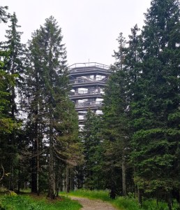 Végül felértünk a Pohorje hegység sípályájához, ahol a kilátó is volt, de szomorúan tapasztaltuk, hogy ebből nem lesz kilátás, hisz teljesen be volt borulva. Így nem sok értelme lett volna befizetni a harmincegynéhány euró belépődíjat, úgyhogy csak lentről néztük meg. De legalább lesz miért visszatérni.