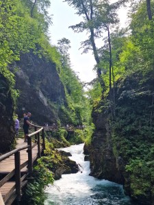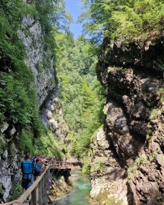 Sajnos pont délre értünk a Vintgar hasadékhoz, amit nem ajánlok senkinek, ugyanis a legtöbb látogató 11 és 15 óra közütt érkezik, ami azzal jár, hogy a hasadék keskeny fapallói tele vannak fényképeszkedő turistákkal és alíg lehet haladni. De ha már itt voltunk, akkor örültünk annak, aminek lehetett, pl hogy kaptunk parkolót egész közel a bejáratnál.