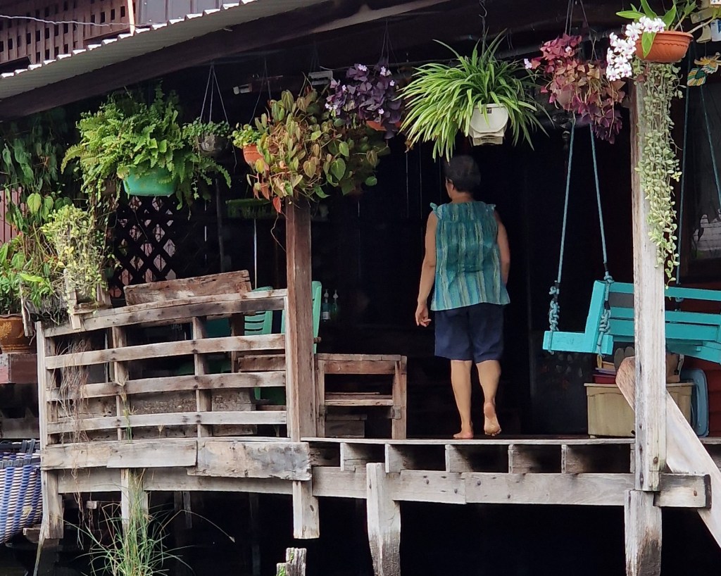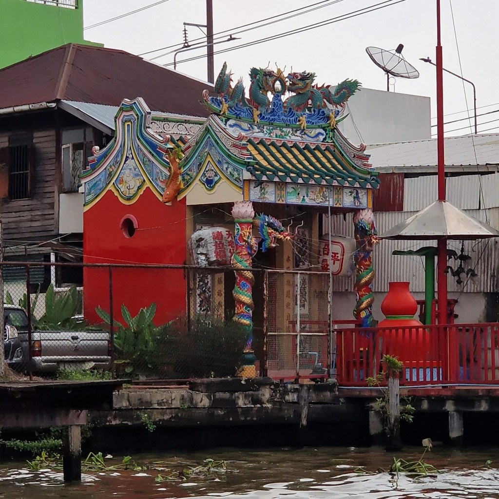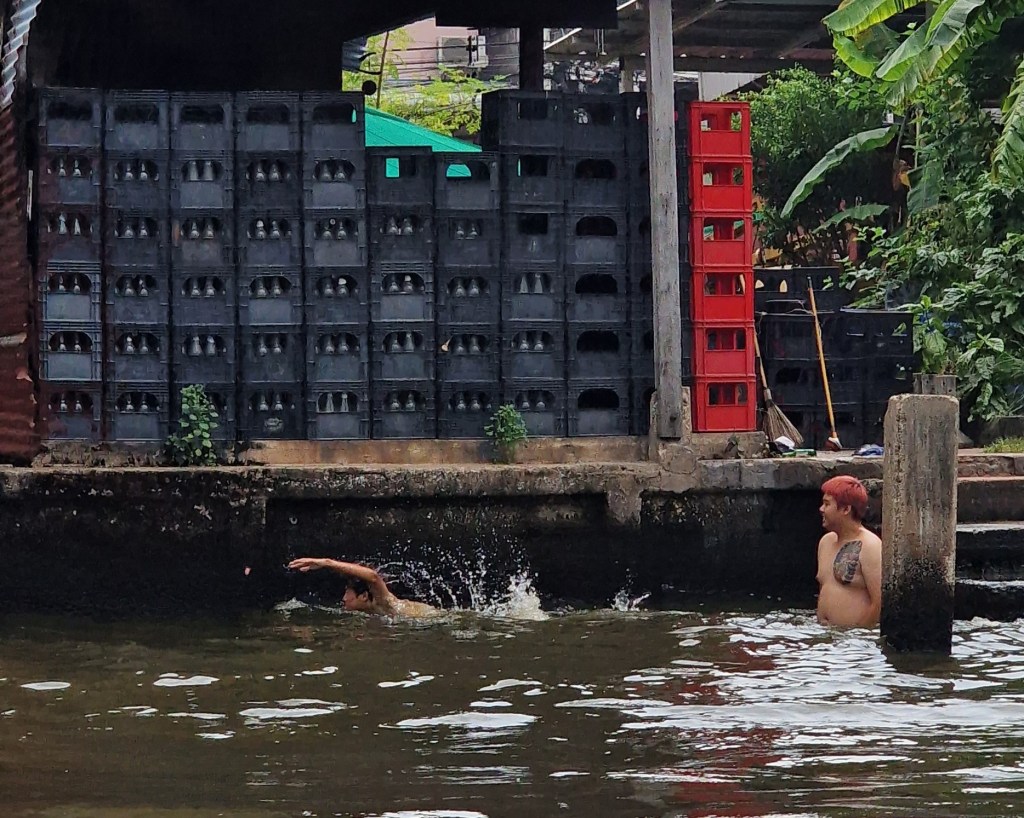 A csatornát kidőlt-bedőlt oldalú viskók mellett egész jól kipofozott házikók, tehetősebb villák, valamint buja zöld bokrok szegélyezik. A házak teraszán mosott ruha szárad, a tetőn parabola antenna veszi az adást, nénikék locsolgatják a szobanövényeket és a gyerekek a folyóba ugrálva szórakoznak. Egész idilli a látvány, ha közben nem csapná meg az ember orrát a bűz és nem látnánk a sok szemetet úszni a vizen. A legbizarrabb látvány az összetákolt házak mögül előbukkanó óriási 69 m magas aranyozott Buddha szobor volt, mely a Wat Paknam templom udvarán található, de mérete miatt messziről idelátszik.