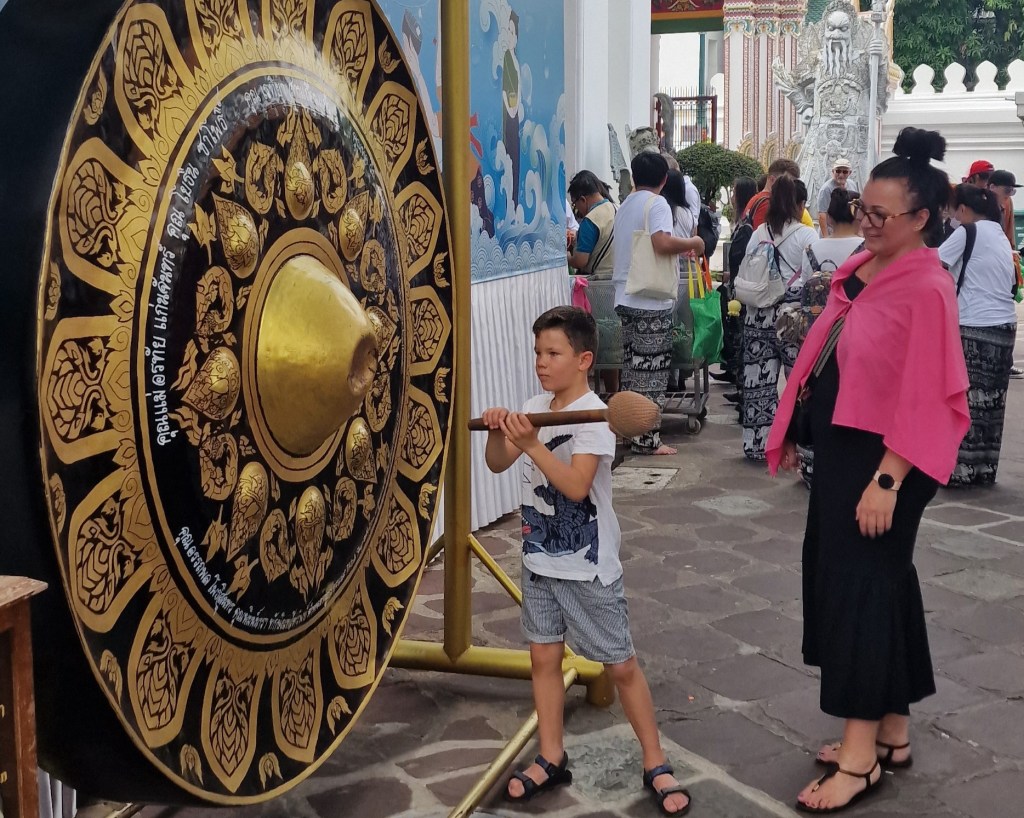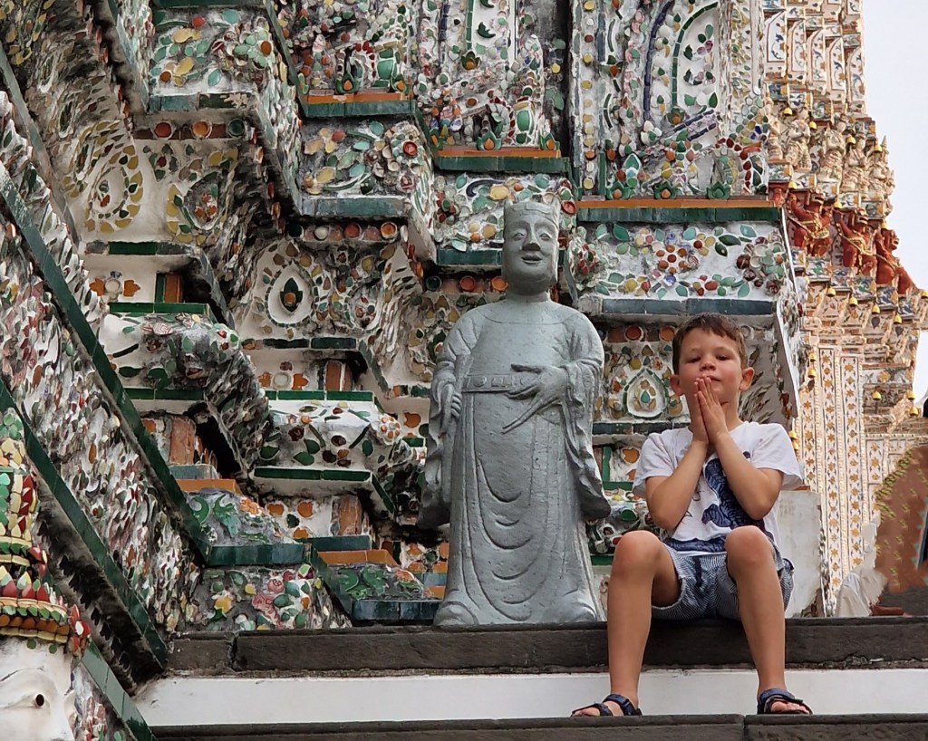 Mivel ez Bangkok egyik fő látványossága, sajnos többszáz más látogatóval kellet osztoznunk a látványon, úgyhogy érdemes korábban érkezni, amikor kevesebb a tömeg. A templom területére belépni vállat és lábat takaró ruházatban lehet, de ha a 35 fokos melegben épp nem így öltöztünk, akkor a bejáratnál lehetőség van sálat kölcsönözni, melyet vállunkra vehetünk vagy csípőnkre tekerhetünk. Nem csinálnak nagy ügyet belőle. A gyereknek a legjobban az teszett, hogy ugrálhatott a lépcsőkön, hogy gyújthatott gyertyát és füstölőt, és hogy kipróbálhatta a gong ütést.