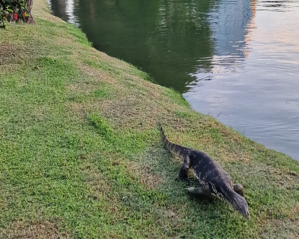 A másik kedvencünk a mesterséges tó volt, amin lehetett volna vizibiciklizni, de mi inkább körbesétáltuk az lombos fák árnyékában. Kiderült, hogy ez egy nagyon jó döntés volt, ugyanis a tó körül  tele volt a park szabadon élő szalagos varánuszokkal, melyek, mint kiderült addig nem veszélyesek, amíg nem heccelik őket, és némelyik akár 3 méteresre is megnőhet. Mondanom sem kell, hogy ez a rész nagyon bejött a gyereknek, és vissza is kellett fognunk a lelkesedését, nehogy megíjessze az állatokat és azok támadni kezdjenek.