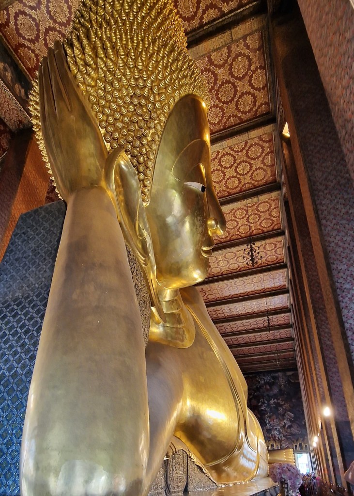 A Wat Pho templom Thaiföld egyik legmagasabb rangú királyi temploma, melyet I Rama király építtetett a 16. században. A templomot Thaiföld első egyetemeként tartják nyilván, valamint ma a hagyományos Thai massázs központja is. A fő ok, amiért mi meglátogattuk, az a 46 m hosszú és 15 m magas aranyozott Buddhaszobor, mely Buddhát fekve ábrázolja. Ez a póz a Nirvánába való belépését szimbolizálja, mely egyúttal a reinkarnációja végét is jelenti.