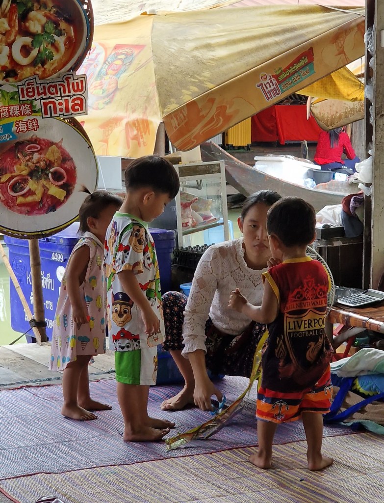 Az úszó piac részét nem úgy kell elképzelni, hogy az árus evez oda hozzánk, hanem a turistákat viszik csónakokkal körbe és megállnak egy-egy érdekesebb árusnál. Van egy autentikusabb rész is, az ételudvar, ahol csak helyiek árulnak csak thai kaját, és itt végig sétálva azt is észrevehetjük, hogy egész családok tartózkodnak itt, anyuka, apuka, nagyszülők, kisgyerek, bébi. Vannak matracok, ágyak, kisgyereknek hinta és járóka, mellette pedig a fazékban gőzölgő thai finomság. Azt az érzést keltette, hogy ezek a családok talán itt is laknak. Alapjában véve tetszett nekünk a hely, főleg a kézműves fagyi volt nagy szám.
