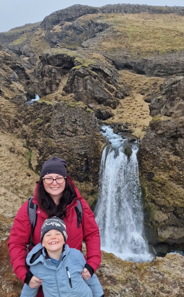 Teljesen véletlenül rábukkantunk egy újabb vízesésre is, ahol rajtunk kívül senki más nem volt, és amiről azt gyanítottuk, hogy valószínűleg innen nyeri a vizét a Seljalandsfoss. Nem időztünk sokat, hisz nagyon durván fújt a szél, és a gyerek még mindig nem volt megszáradva az előző kalandja után.