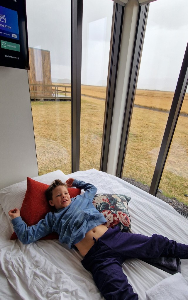 Ezért gyorsan visszatértünk a szálláshoz, amely az egyik “legizlandosabb” szállásunk volt, hisz a természet közepén, egy gyönyörű kilátással és üvegfalakkal rendelkező kis kunyhó volt, aminek egyetlen hátulütője az volt, hogy lehetetlen volt besötétíteni.