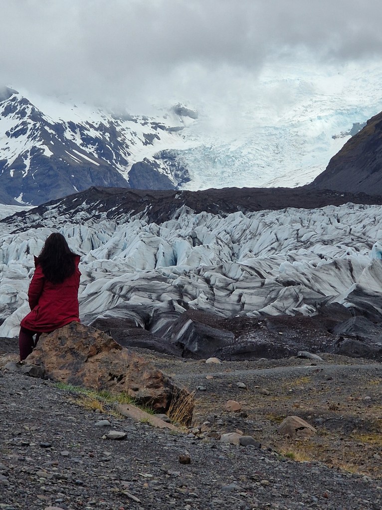 Csodálatos érzés volt úgy látni életem első igazi gleccserét, hogy nem volt ott rajtunk kívül senki más, hogy azt sem tudtam, hogy hívják, hogy híres-e vagy sem, csak ott álltam és próbáltam a szememmel a hegytetőig követni a napfényben türkiz-fehér színekben csillogó jégtömböket, melyeket a gleccser lábánál még szürke lávahomok piszkított be, de minél feljebb, a hegyorom felé pásztázott a szemem, annál tisztább és átlátszóbb, fagyott hullámokhoz hasonló jégzuhatagot láttam.