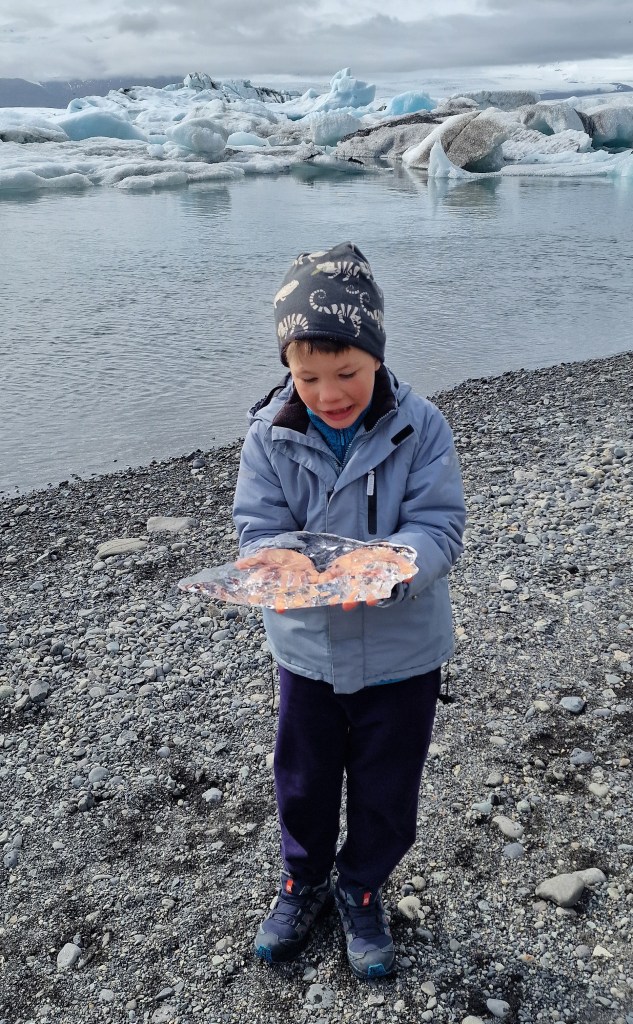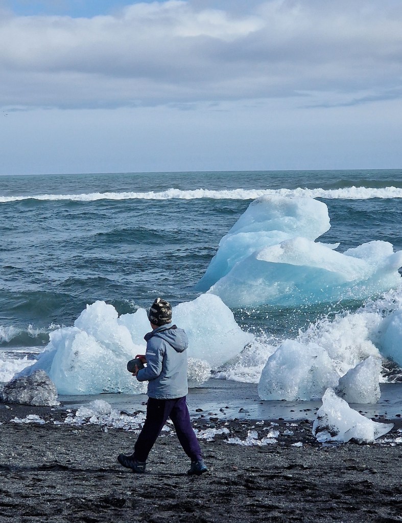 Miután leparkoltunk, elindultunk a gleccsertó partján kijelölt ösvényen, hogy minél távolabb sétáljunk a tömegtől, és sikerült is olyan messzire elgyalogolnunk, hogy úgy érezzük, csak mi vagyunk és a hatalmas jégtömbökkel beborított tó. Amíg a gyerek itt is kavicsokat dobált a tóba addig mi megpróbáltuk megélni a természet végtelen lassúságát, ahogy azt figyeltük, hogy a gleccser mit sem törődve a világgal, az időtlen csend éteri nyugalmával leomlik a tóba, jégdarabok formájában sosem ismétlődő műalkotást létrehozva, melyek komótosan úsznak tova az óceán felé, mint óriási gyémántok.