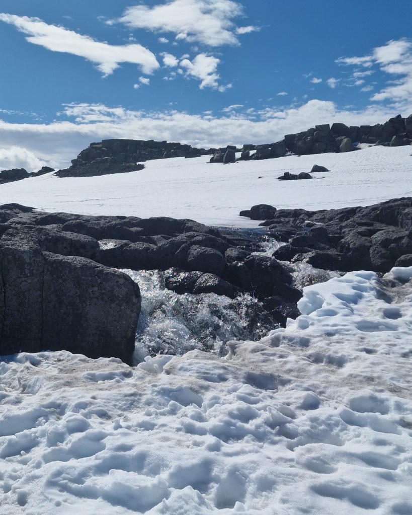 A gyerek nagyon ügyesen be is tartotta a szabályt, de sajnos a kijelölt ösvényen uralkodó latyak már túljárt az eszén és az egyik helyen nem sikerült elég nagyot ugrania, ezért térdig az olvadt hóban landolt. Egy kis kezdeti ijedtség után továbbmentünk, és azzal vigasztaltuk magunkat, hogy ha már túl van egy vízesésben tusoláson, akkor ezt is túléljük valahogy, és ilyen rövid idő alatt csak nem fázik meg.