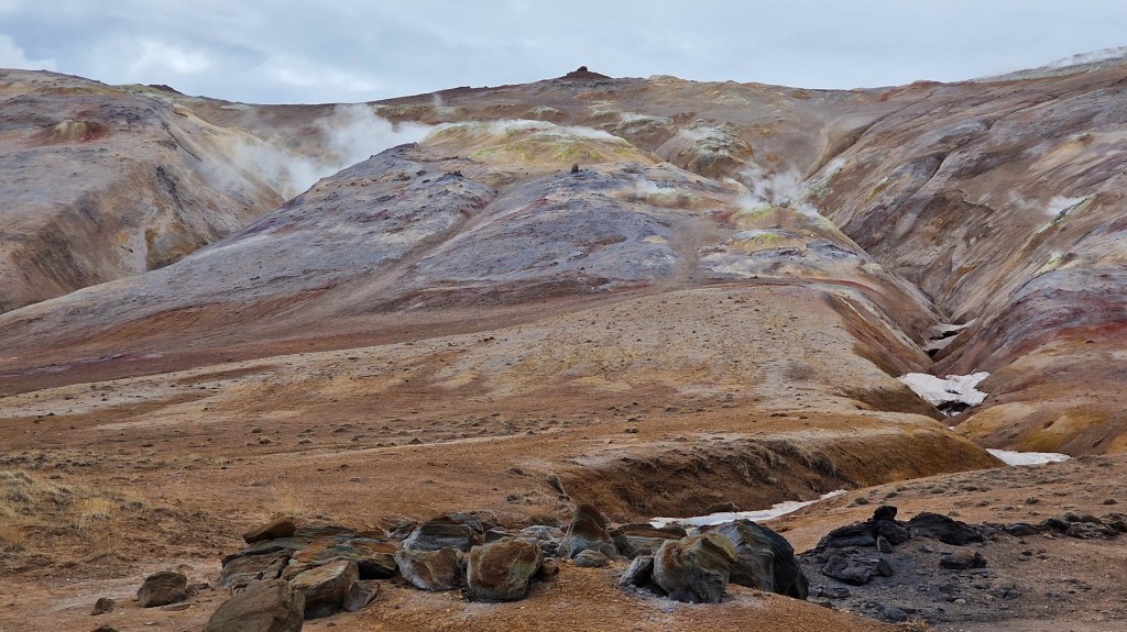 A hely hamar bejátható és a szag miatt nem is igen lehet több időt kibírni itt, kivéve, ha felmászunk a színes hegyre, amit mi ezúttal kihagytunk és tovább indultunk a méltán híres Myvatn tó felé.