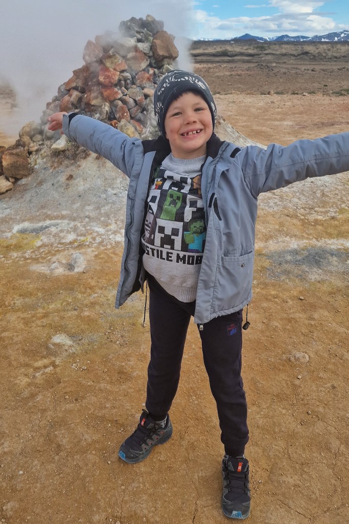 Dettifoss utáni következő megállónk a Hverir geotermikus terület volt. Ez a hely valóban olyan, mintha egy idegen bolygóra csöppentünk volna. A vörös és sárga minden árnyalatában kirajzolódó vulkáni hegy aljában gőzölgő fumarólák, azaz füstölgő lyukak és a fortyogó sármedencék nemcsak minket, hanem a gyereket is elvarázsolták.