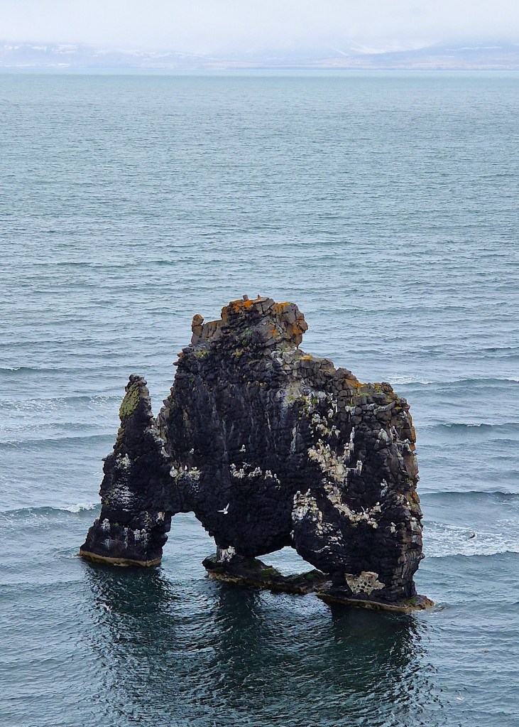 Másnap reggel az 5 napos izlandi körutunk végén újra Reykjavík felé vettük az irányt, de mivel nem siettünk, útba ejtettünk még pár látványosságot. Az első a Hvitserkur szikla volt, amely kb. 200 km-re keletre található Akureyritől, és ami egy hatalmas bazaltszikla közvetlenül a part közelében az Észak Atlanti óceánban. Érdekessége, hogy 15 méter magas, és formára olyan, mintha egy ivó dinoszaurusz lenne.